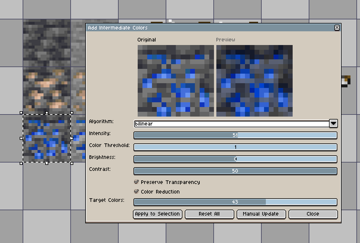 Applies one of 5 processing algorithms (edge_smoothing, bilinear, anti_aliasing, selective_smooth, smart_dither) to smooth textures. Includes intensity control, color sensitivity threshold adjustment, brightness and contrast controls, and palette reduction options.