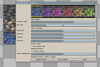 Creates up to 8 color variants from a single texture with configurable hue shift angles (5°-180°). Features advanced color correction including saturation, brightness, and contrast adjustments, plus an accent color system with customizable strength and color temperature controls.